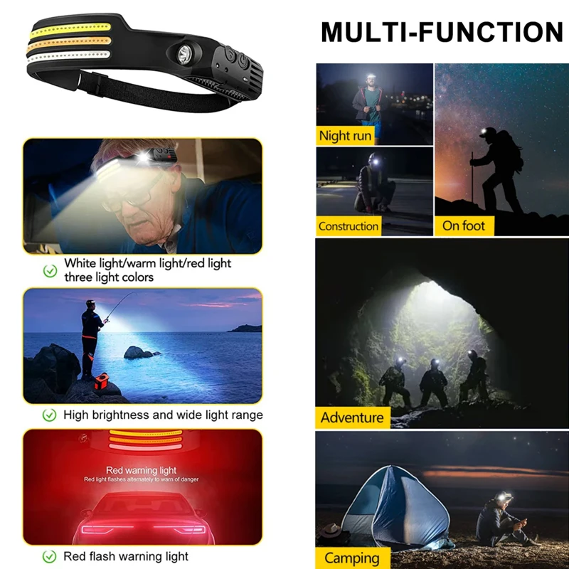 【SUPER BRIGHT &230° WIDE COB BEAM】: LED Headlamp with 4.7inch super bright COB wide beam, The new 230° wide beam headlight allows you to illuminate the viewing area without moving your head, 450lumens brightness and 350ft distance output. Great for outdoor enthusiasts as camping gear. Whether you are camping, exploring, hiking, biking, fishing, climbing, repairing and other outdoor or indoor activities, our headlights are your great assistants.