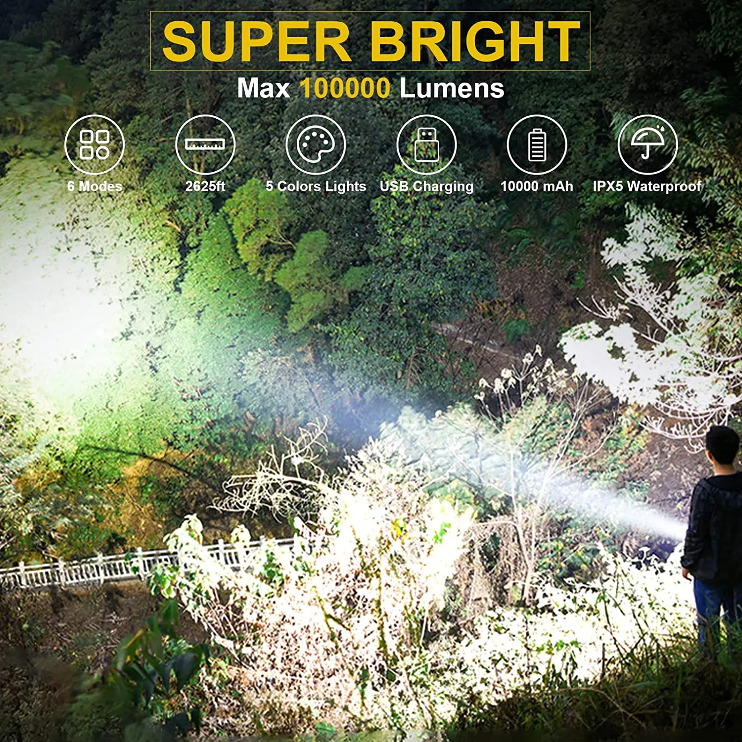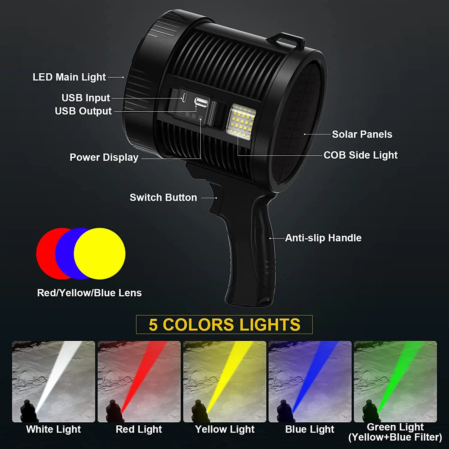 Rechargeable Spotlight, Super Bright 100000 High Lumens LED Spot Lights, Handheld Flashlight Large Solar Searchlight with Cob Light, 6 Modes, 4 Color Light, IPX5 Waterproof for Hunting Camping