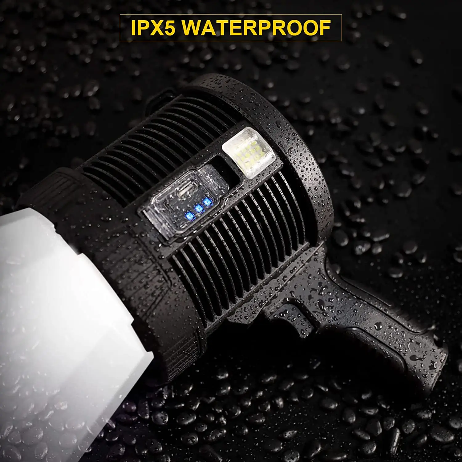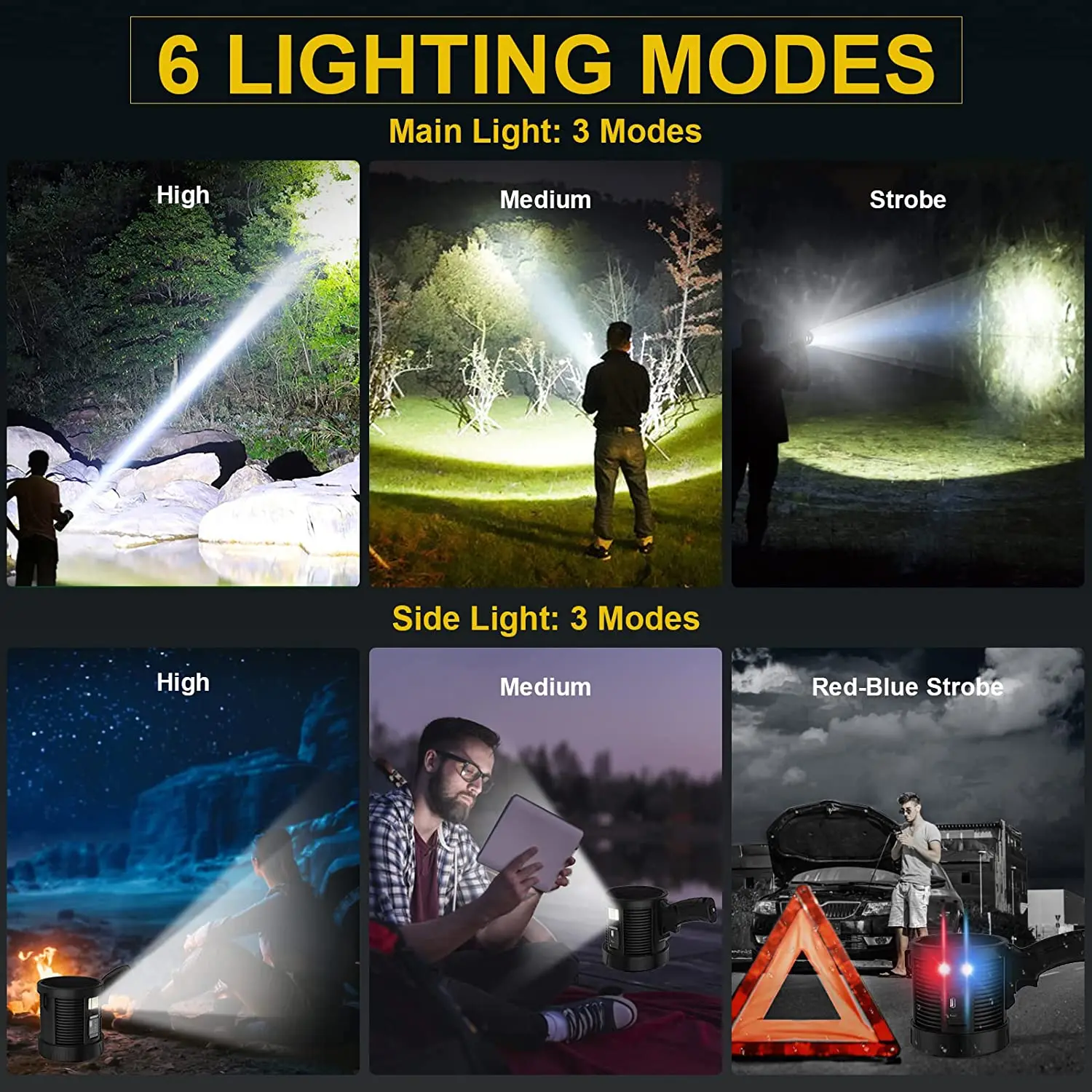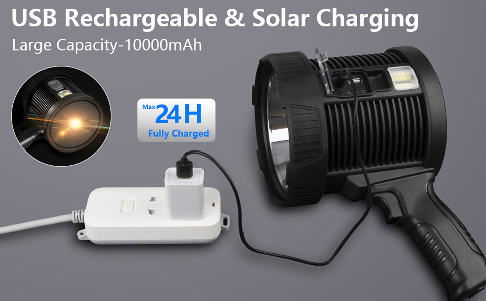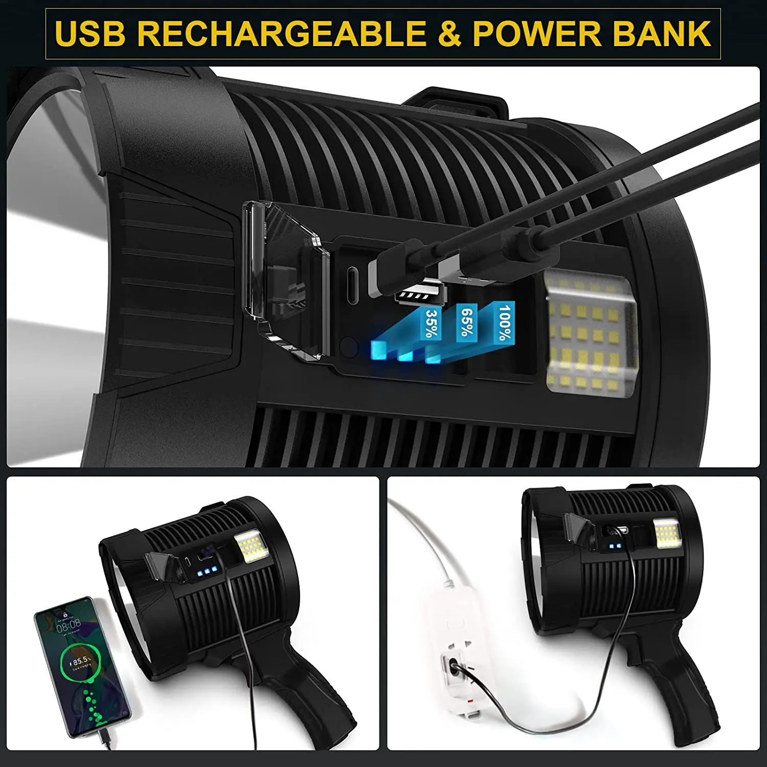 🔦100000 High Lumens spotlight. This is a 100000 Lumens spotlight with an updated XH-P90 chip that is not only durable but offers 6 different modes for lighting. Convenient solar charging and USB charging can come in handy during power outages, hiking or camping trips, or fixing something in the dark.