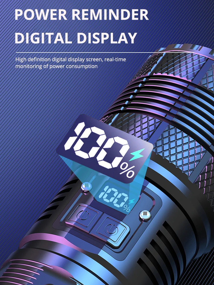 2.【UPGRADED USE TIME & POWER BANK & DIGITAL DISPLAY】The rechargeable flashlight has been newly upgraded to shorten the charging time and prolong the service life, and can be used continuously for 12 hours. The unique digital display of battery percentage also lets you no longer have to worry about the remaining battery. The built-in large-capacity battery and USB smart fast charging also make charging faster, and you can use it as a power bank to charge your phone for emergencies.