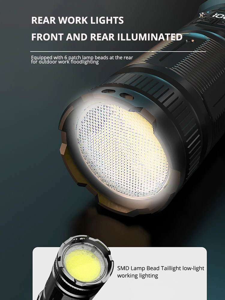 1.【12000000 LUMENS SUPER BRIGHT FLASHLIGHT】This unique high lumen LED rechargeable flashlight can be illuminated on both front and back ends. Unlike other high lumen flashlights with exaggerated values, this led flashlight has a true maximum of 120000 lumens, and the ultra-wide beam can easily illuminate Brighten the whole room and backyard and even the football field, the farthest illumination distance is 3280ft, it can be widely used in emergencies, camping, night hiking, fishing and hunting.