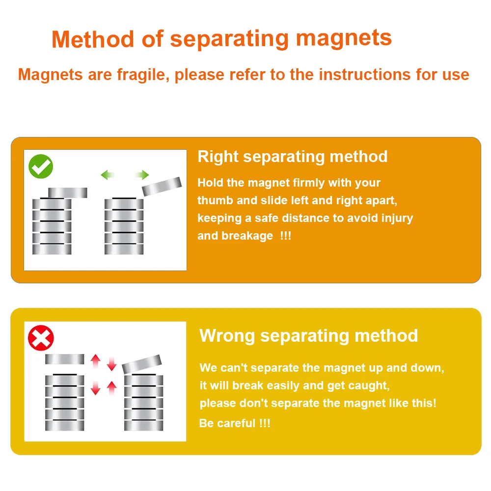 2: Neodymium magnets are very fragile and easy to damage, please handle with care. Powerful magnets are made of rare earths at high temperature, which cannot guarantee 100% perfection. Its small flaws will not affect its performance and use, and those who mind should buy with caution.