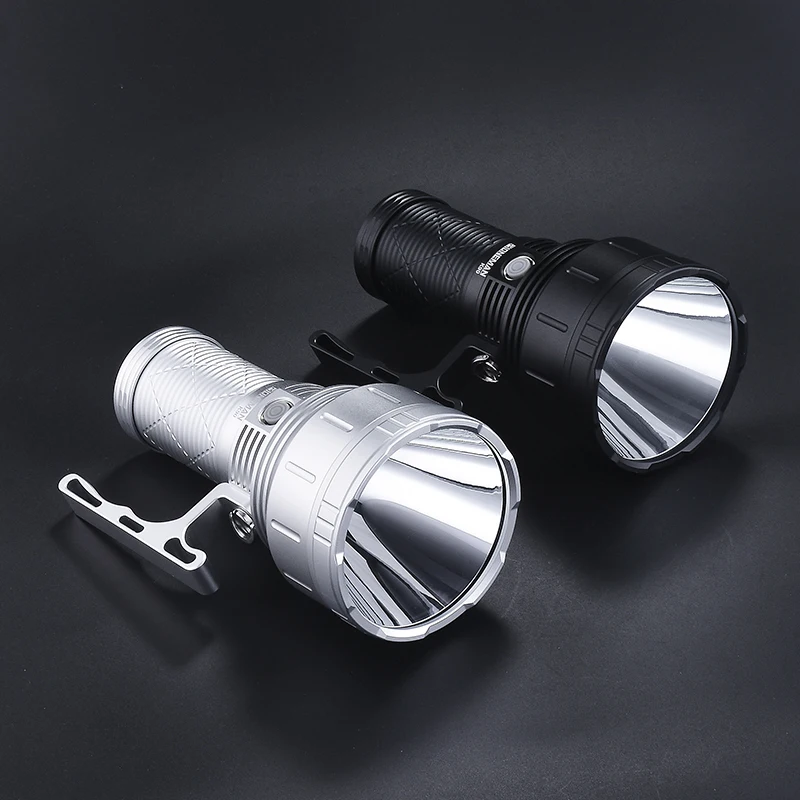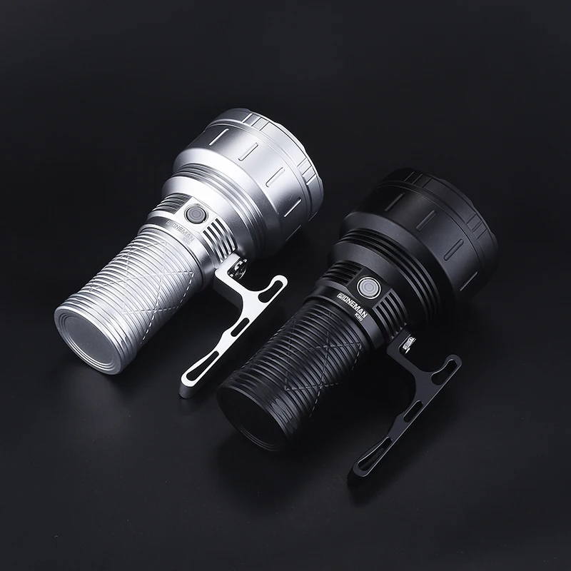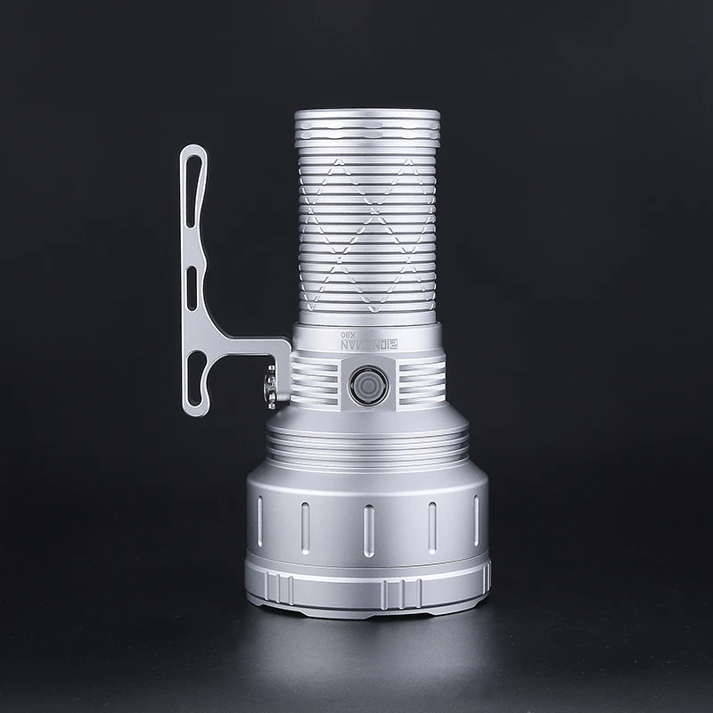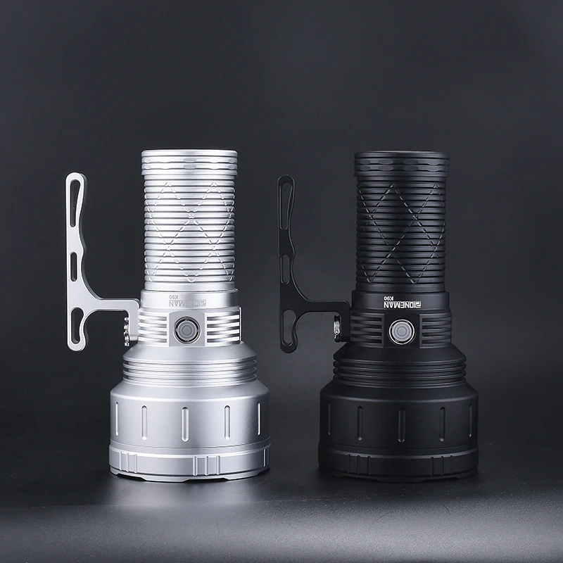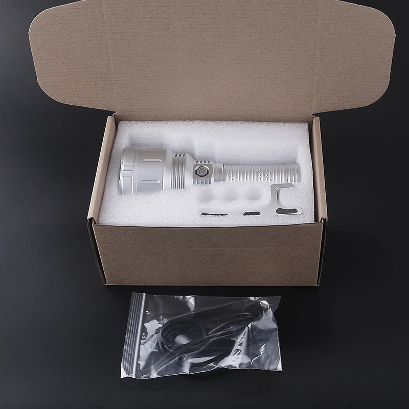 Material: aluminum alloy Tail spring material: phosphorus copper nickel plating Shell color: black, silver Description of oxidation: Silver is common oxygen, and black is hard oxygen. Low pressure warning: Yes. Reverse polarity protection: Yes. Lens type: double-sided green coating Reflector: smooth surface Switch position: center side press Pattern memory: Yes. Tail handstand: Yes Waterproof grade: IPX6 Charging current: 2A max Battery and charger include: not included. Battery type: 21700*3 LED:SBT90/SFH55 Color temperature: SBT90:6000K SFH55:5700K Lumen value: SBT90 version: 6300lm SFH55 version: 12000lm Light intensity: SBT90 version: 78w SFH55 version: 24w LED substrate: 40mm Size: head diameter: 90.8mm battery compartment diameter: 50.3mm flashlight length: 178mm Net product weight: about 630g. Complimentary: handle *1, quick release screw *1, waterproof ring *2, key rubber cap *1, charging rubber cap *1, hand rope *1, A to C charging cable *1. The flashlight has under-voltage protection and temperature control protection. Description of SBT90 circuit board driver: Output voltage: 3V Output current: 28A SFH55 circuit board driver description: Output voltage: 3V Output current: 50A The operation logic is as follows: Click: power on, shift mode (4th gear: 10% 20% 40% 60%) Double click: extremely bright (100%) Strike Three: Flash (100%) Four strikes: voltage detection Five strikes: lock function (five strikes again to unlock the function) Press and hold for 0.3-0.5 seconds to turn it off. Press and hold to enter the moon gear (0.001%) when it is turned off. Charging status: the red light is charging, and the green light is full.