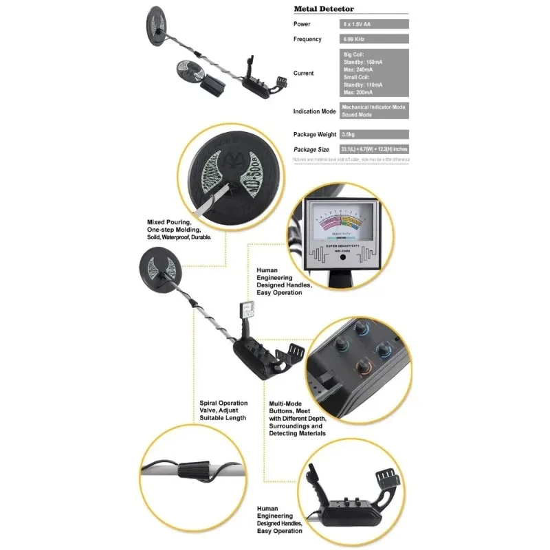 (5) Max Detection: Small coil: 1.5 meters Big coil: 3.0~3.5 meters This conclusion is elicited by testing a aluminium sheet (60cm*60cm*1cm) buried in dry soil.