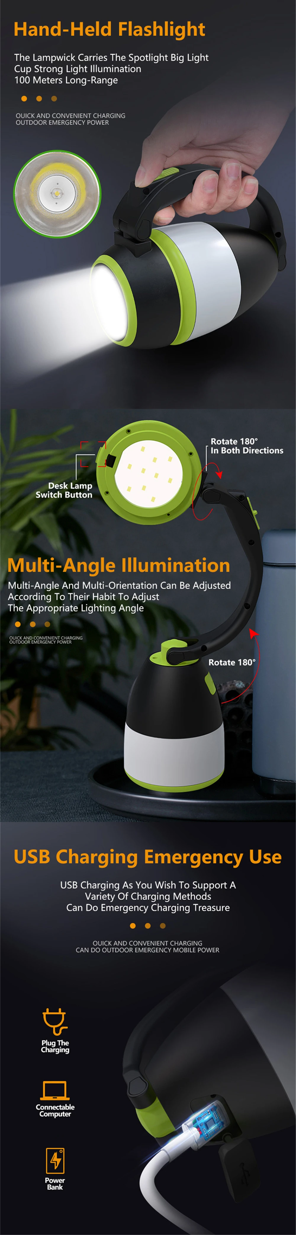 It can be used as a handheld flashlight, camping lantern and table lamp according to different needs. You can adjust the angle, 180 degrees free adjustable, 360-degree rotating lighting, perfect for your reading, work, study and outdoor usage.