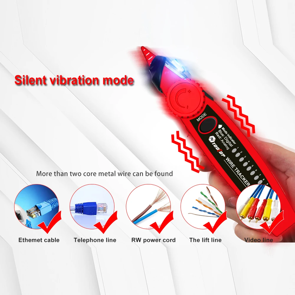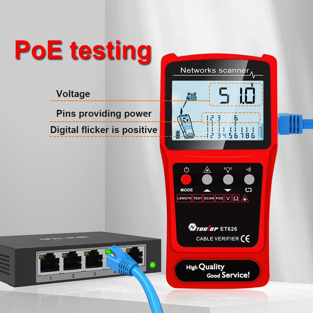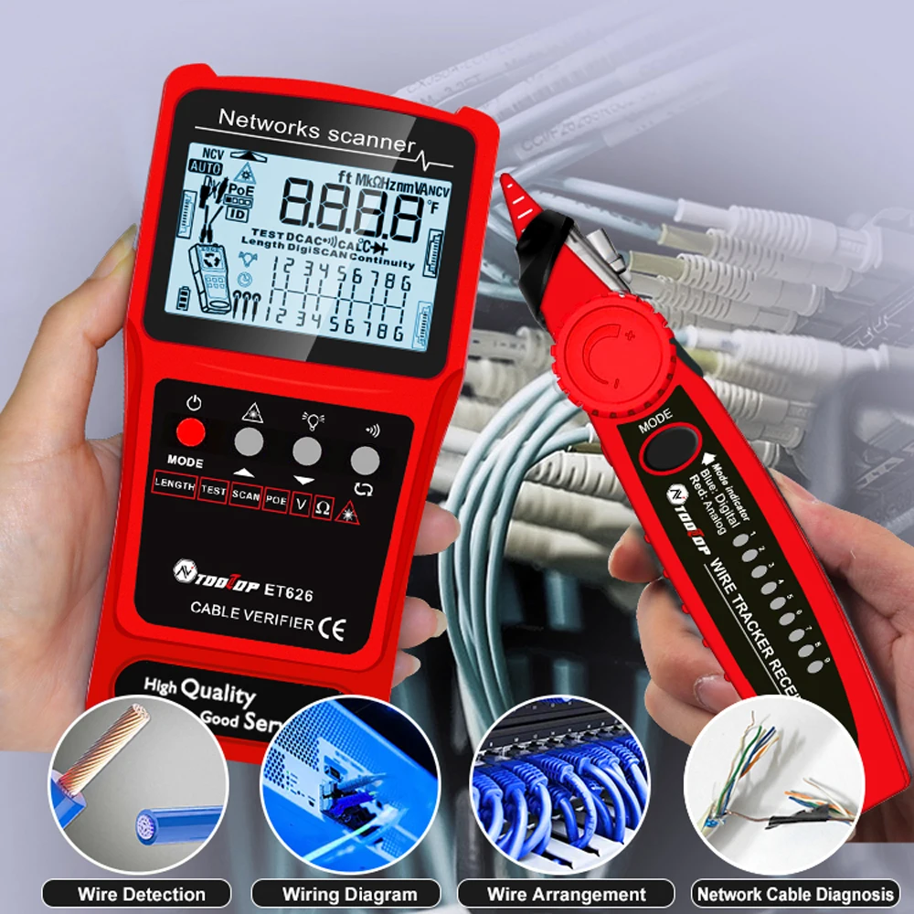 Multifunctional Cable Tester: This cable tester has the function of analogue tracing, cable mapping, PoE voltage measuring, digital tracing volumes and sensitivity adjustable, automatic shutdown, and cable length self-calibration function.