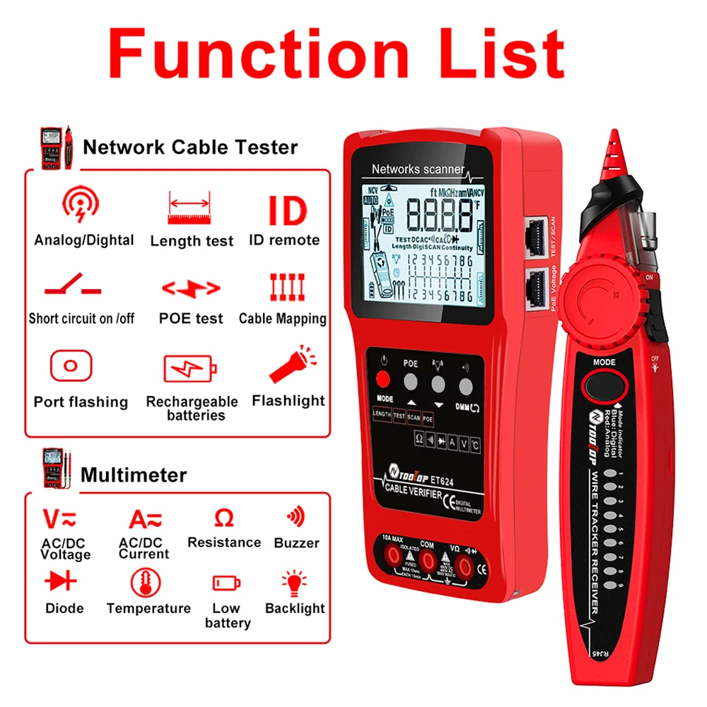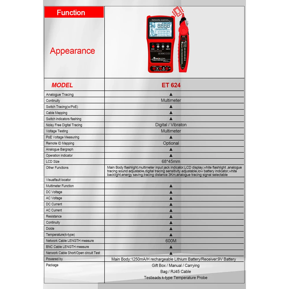 ET624: Multimeter Function, ACV, DCV, DCA, Alternating Current current, Resistance, Continuity Buzzer, Diode, Temperature, Coaxial Cable Length Measurement, Network Cable Short Circuit and Circuit Break Test