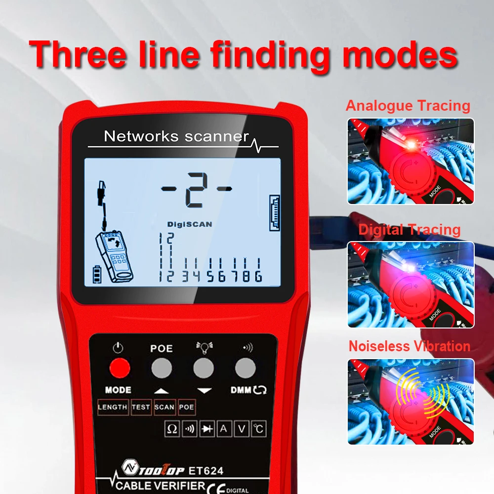 Multifunctional Cable Tester: This cable tester has the function of analogue tracing, cable mapping, PoE voltage measuring, digital tracing volumes and sensitivity adjustable, automatic shutdown, and cable length self-calibration function.