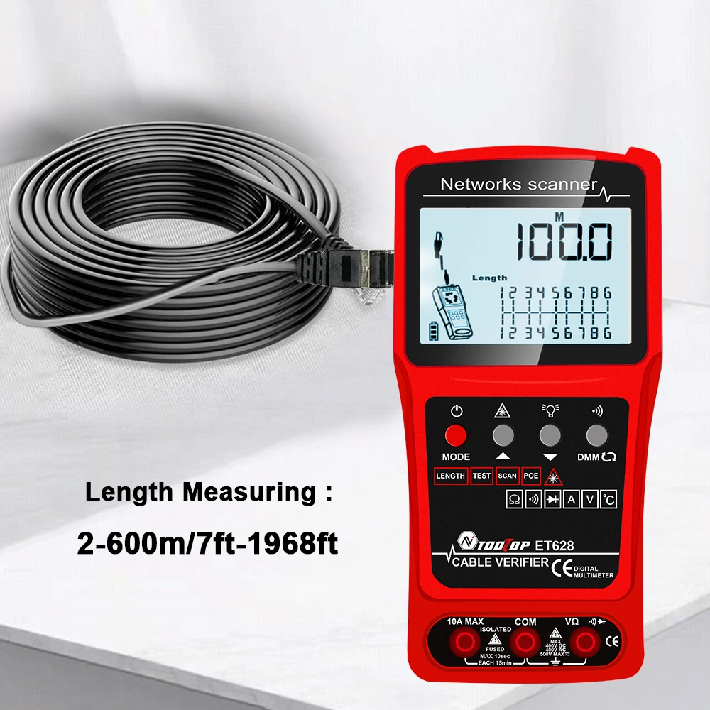 ET628: Multimeter Function, Red Laser Pen, ACV, DCV, DCA, Alternating Current current, Resistance, Continuity Buzzer, Diode, Temperature, Coaxial Cable Length Measurement, Network Cable Short Circuit and Circuit Break Test