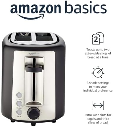 Amazon Basics 2 Slice, Extra-Wide Slot Toaster with 6 Shade Settings, Black & Si …