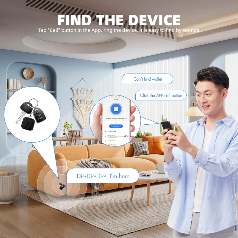 Click the "call" button on the APP, The anti-loss device LED flickers for 10 seconds and sends out a soundreminder. The more circles displayed on the APP panel, the closer the mobile phone and the anti-loss deviceare.