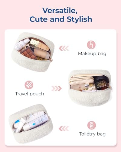 【Soft and Durable Fabric】: Crafted from warm and fluffy lambswool fabric, this make up bag provides a soft and comfortable touch. Its fashionable and cute color scheme complements your fashion, positioning it as a must-have cosmetic bag for the winter season.