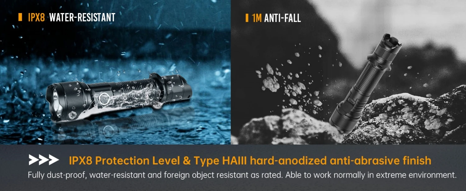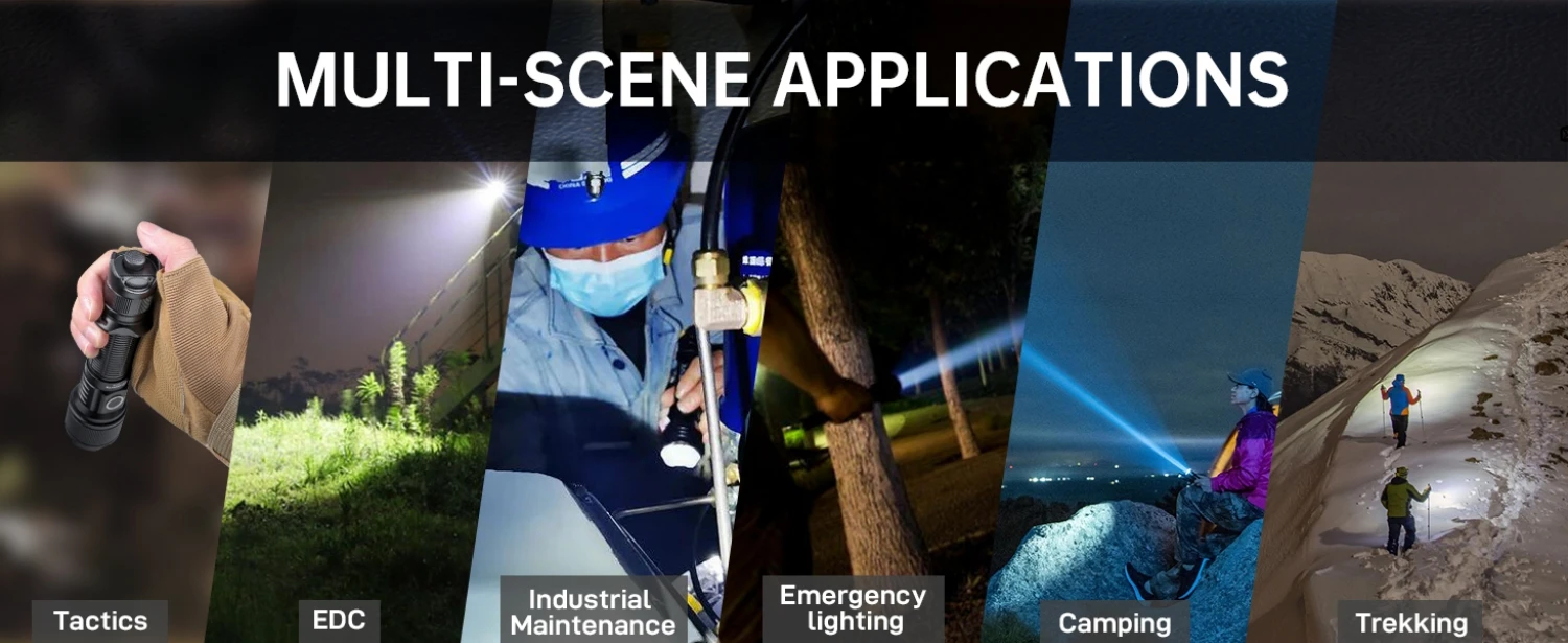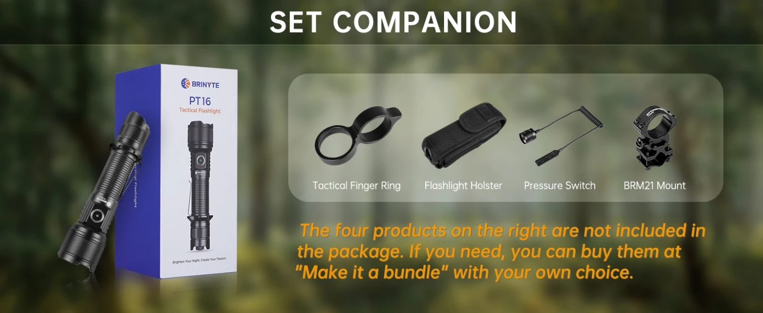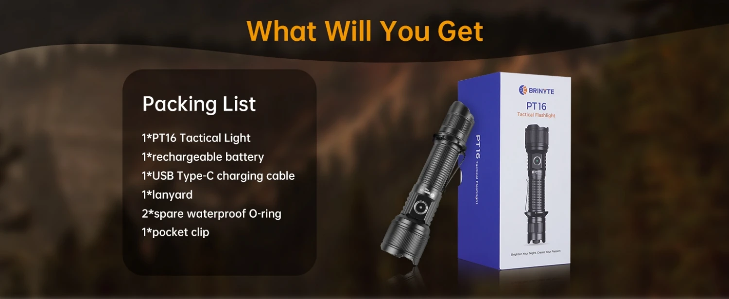 Rechargeable battery provides you with strong power support. USB-C charging system makes charging no longer a burden! IPX8 waterproof ensures that the PT16 still maintain good performance in bad weather! The lock function of front switch prevents the accidental opening of the PT16. And the memory function help PT16 remember the last mode you used! Ideal for camping,hiking,maintaining,searching,emergency and other ourdoor uses.
