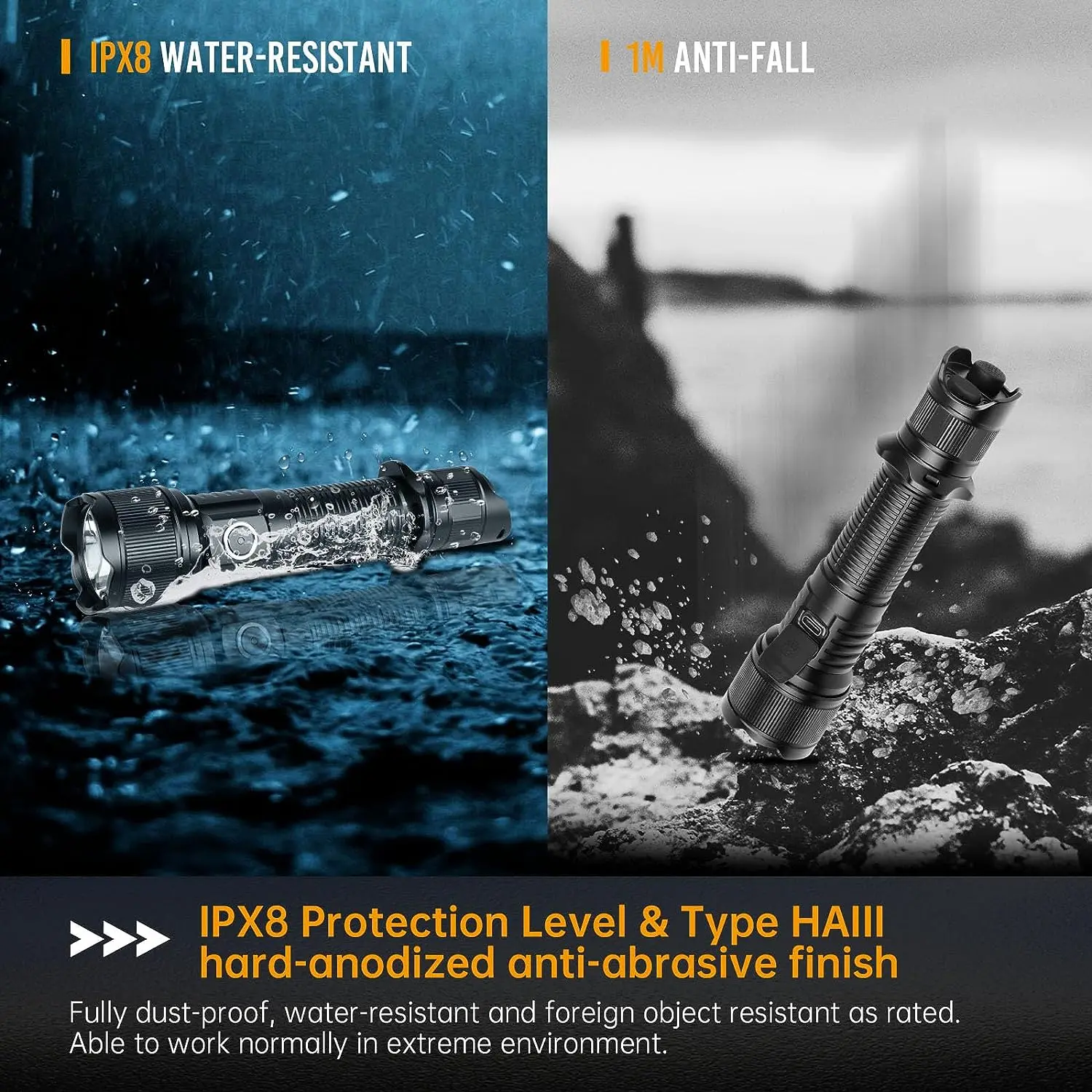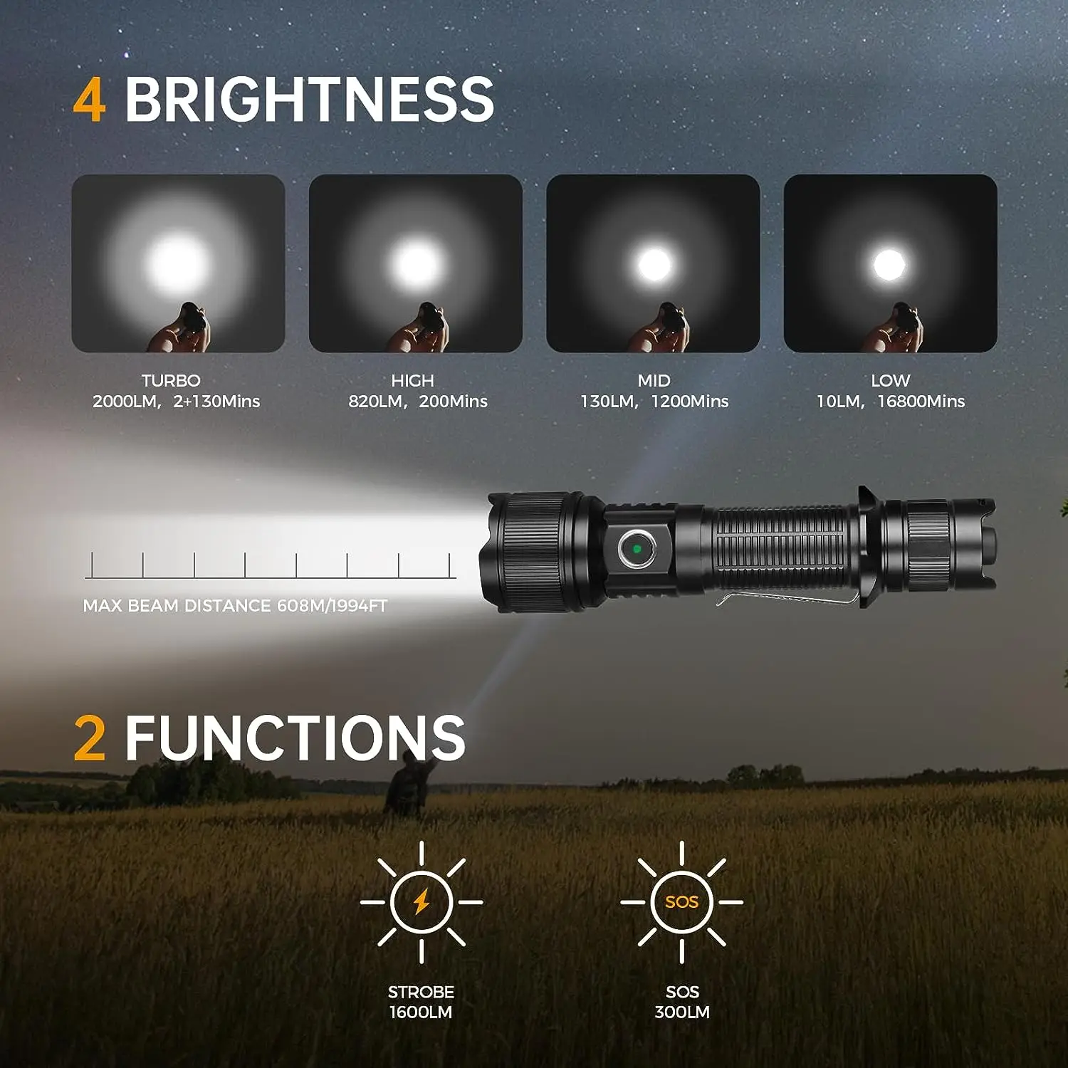 【Super Bright & Long Range】- Equipped with a High-Intensity LED, the maximum brightness is over 2000 lumen, it's a portable powerful flashlight which is practical for outdoor illumination and daily use. The maximum beam distance is 608m/1944ft, can light up your whole yard.