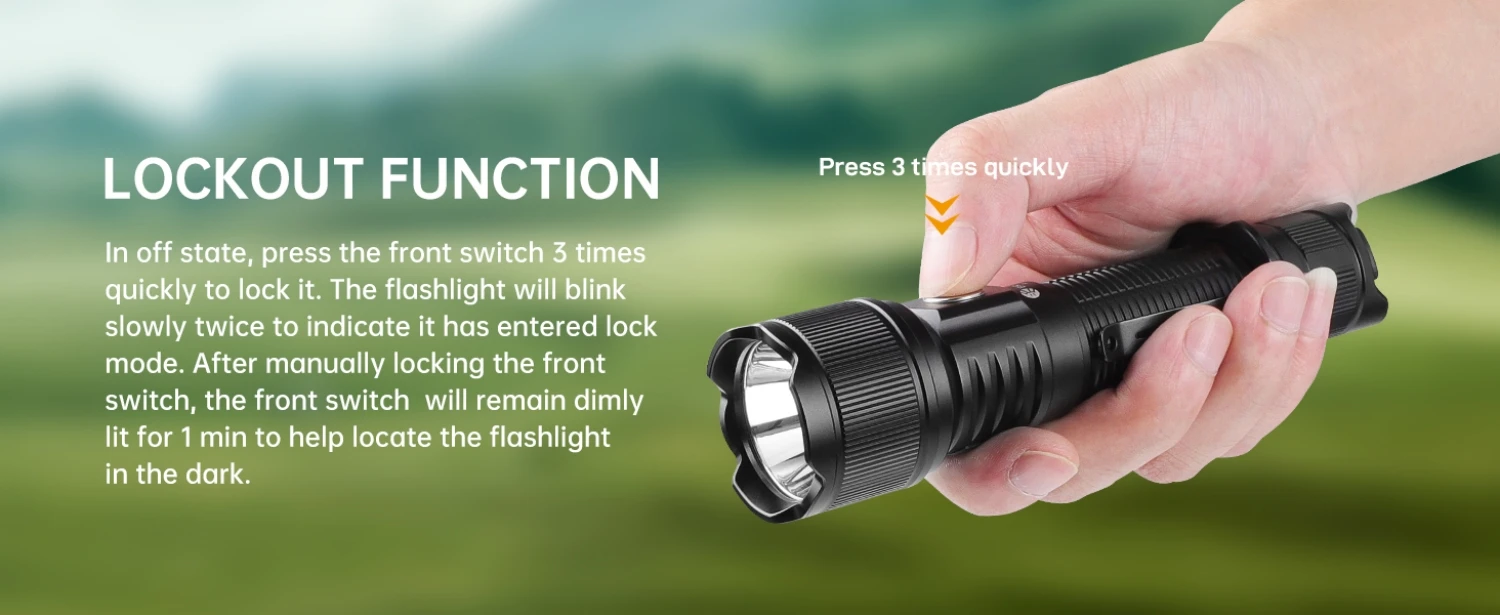 【Lockout Function】– In off state, press the front switch 3 times quickly to lock it. The flashlight will blink twice to indicate it has entered lock mode. After manually locking the front switch, the front switch indicator light will remain dimly lit for 1 minute to help locate the flashlight in the dark.