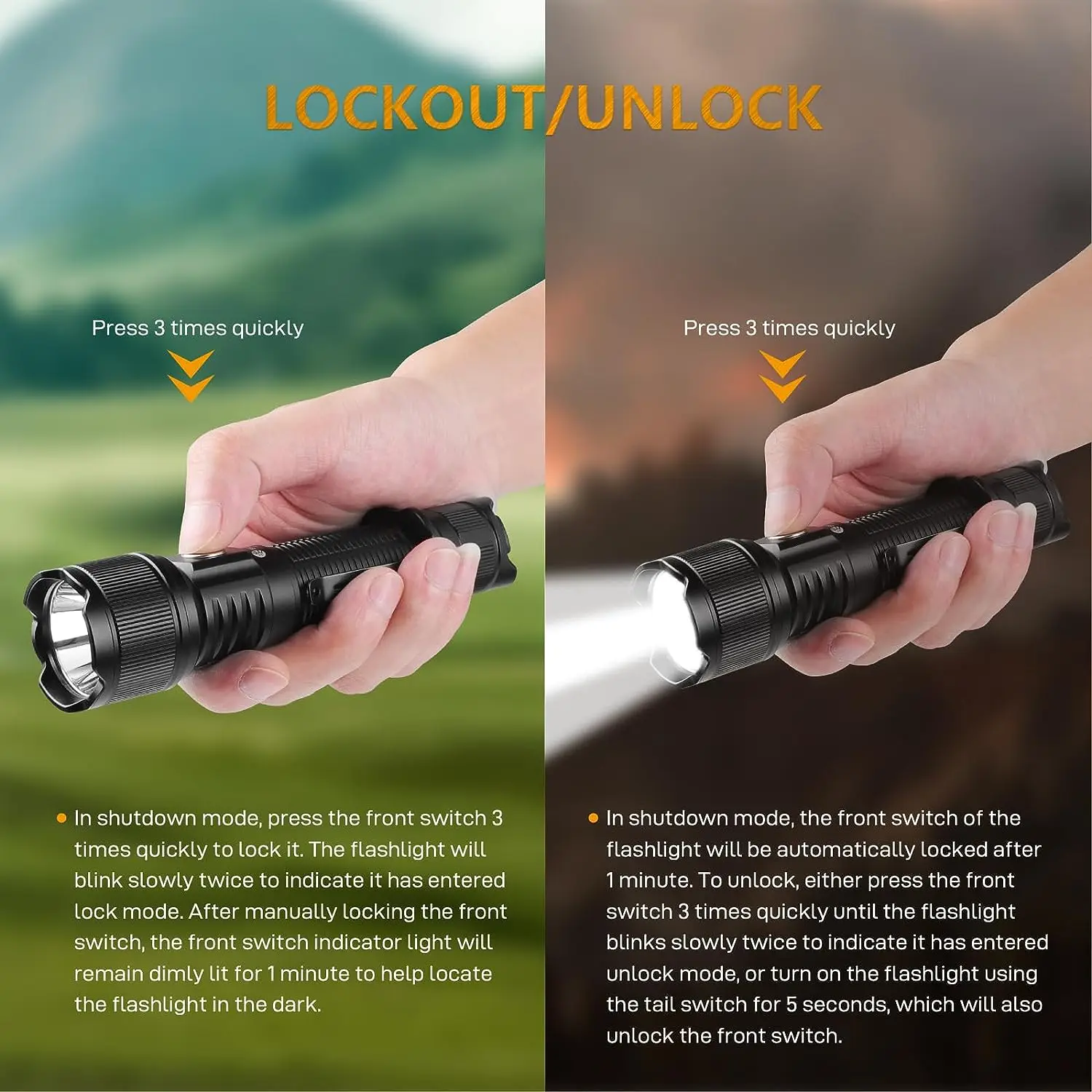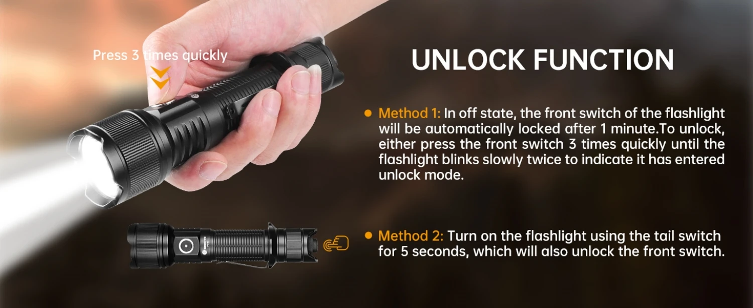 【Unlock Function】– In off state, the front switch will be automatically locked after 1 mins. To unlock, either press the front switch 3 times quickly until the flashlight blinks slowly twice to indicate it has entered unlock mode, or turn on the flashlight using the tail switch for 5 seconds,which will also unlock the front switch.