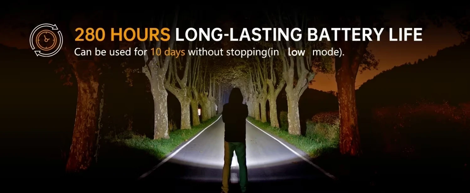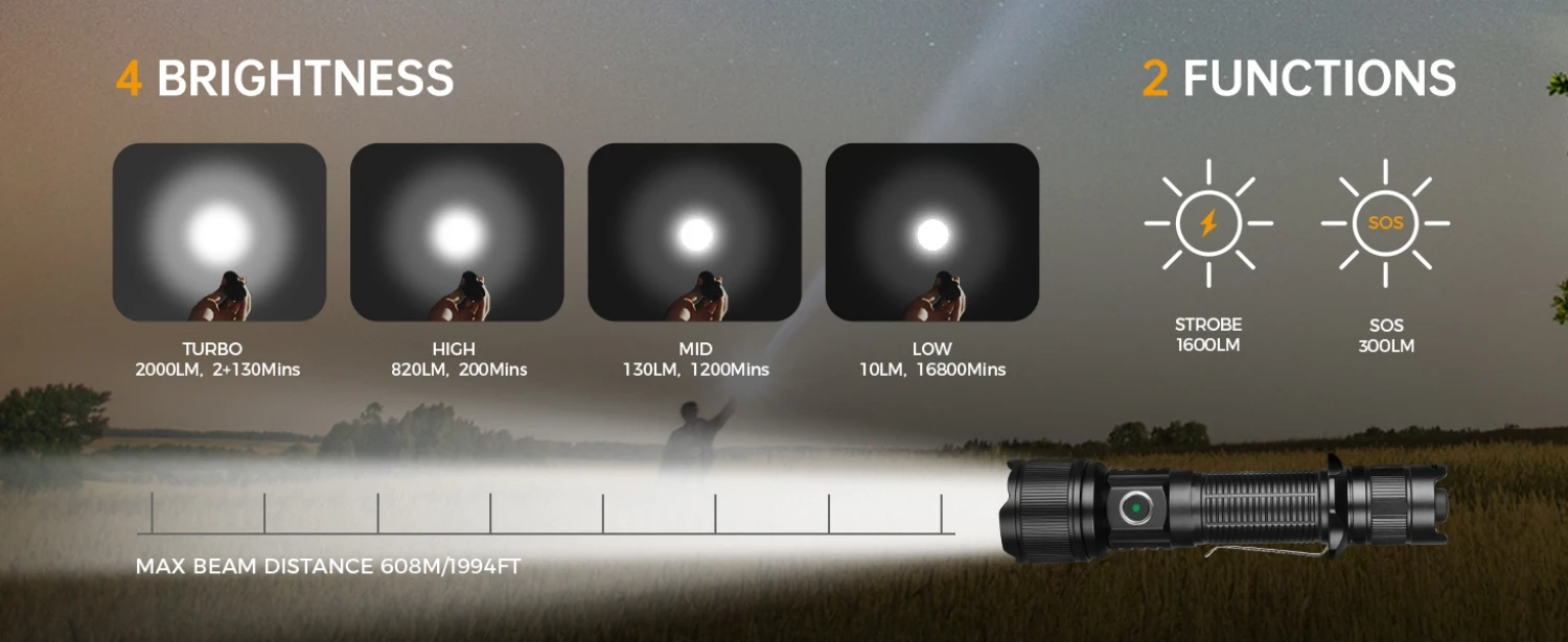 2000 lumens,608 beam distance,Up to 10 days run time (In low mode).