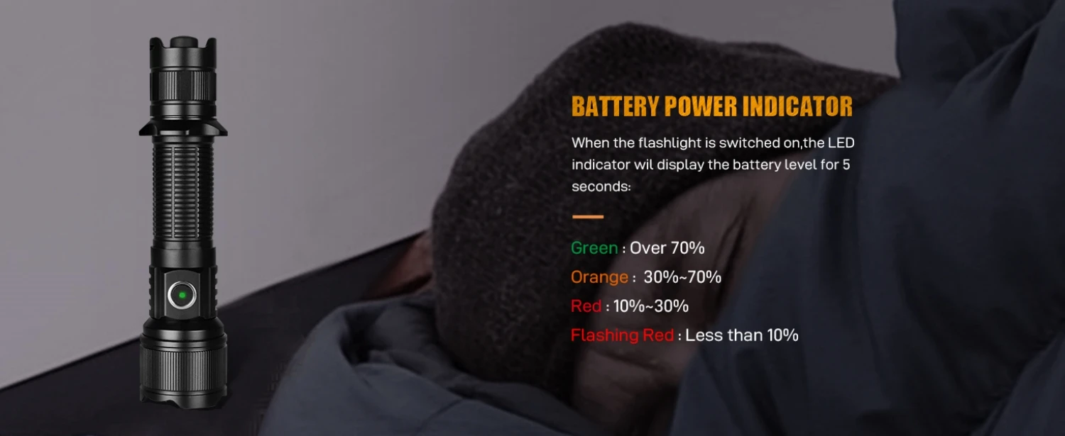 【Smart LED Battery Indicator】- The built-in battery power indicator of the side switch clearly displays the remaining battery level in real time: Green (over 70%), Orange (30%-70%), Red (10%-30%), Red flash (<10%), friendly reminds you to charge the flashlight in time, to avoid dilemma when you urgently need it.