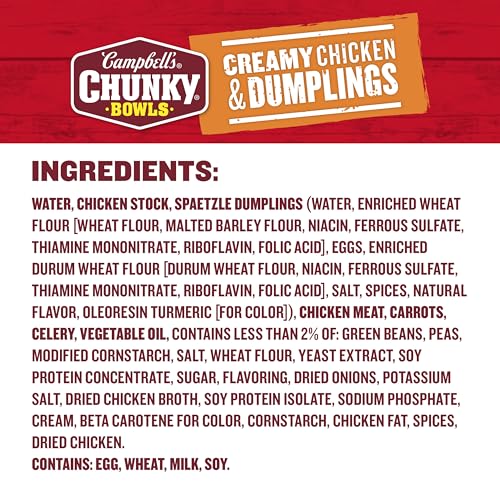 Campbell’s Chunky Soup: One (1) 15.25 oz microwavable bowl of Campbell’s Chunky Creamy Chicken and Dumplings Soup
