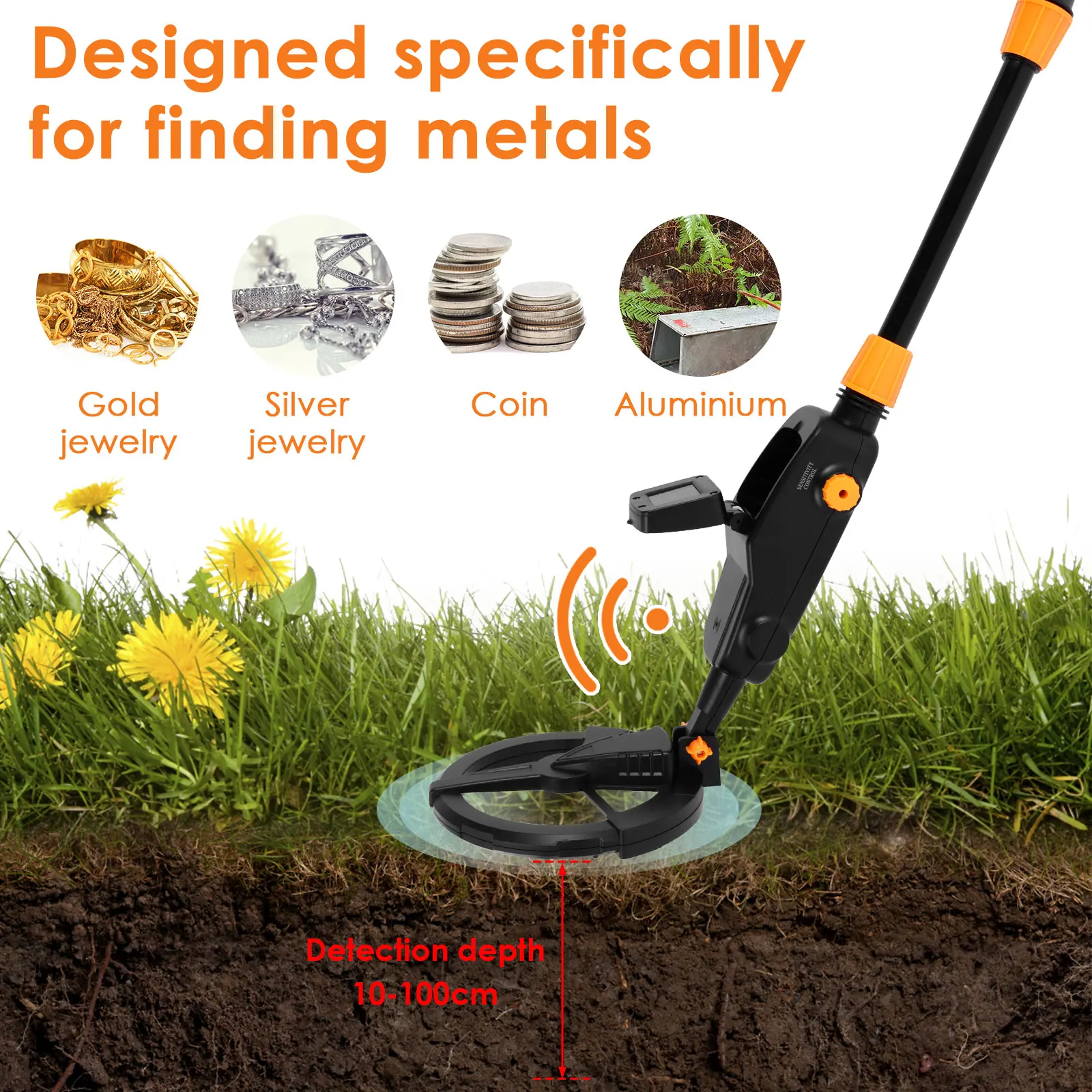 [Designed for Finding Metals] This metal detector is designed for searching metal which has a detection depth range of 10-100cm depending on the target area you detect. Perfect for kids to play treasures exploration game, detecting gold and silver jewelry, coins and other metals.