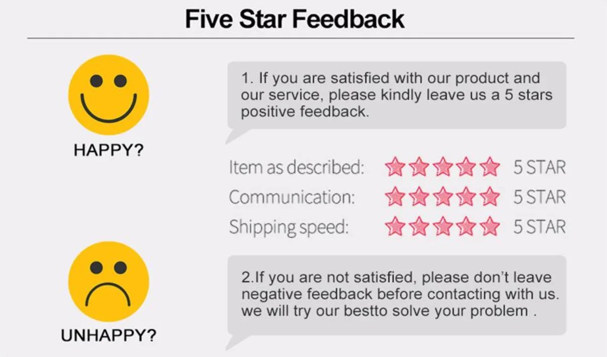 If you are satisfied with our products and services, please leave your positive feedback and 5 star, this will be greatest support for us;If you don't satisfied our porducts, pls contact us before you leave neutral (3 stars) or negative (1-2 stars) feedback.We guarantee we will 100% slove any problems for you.Please contact us before you leaving the negative feedback or opening any dispute on the site.Communication is the best way to solve the problems.