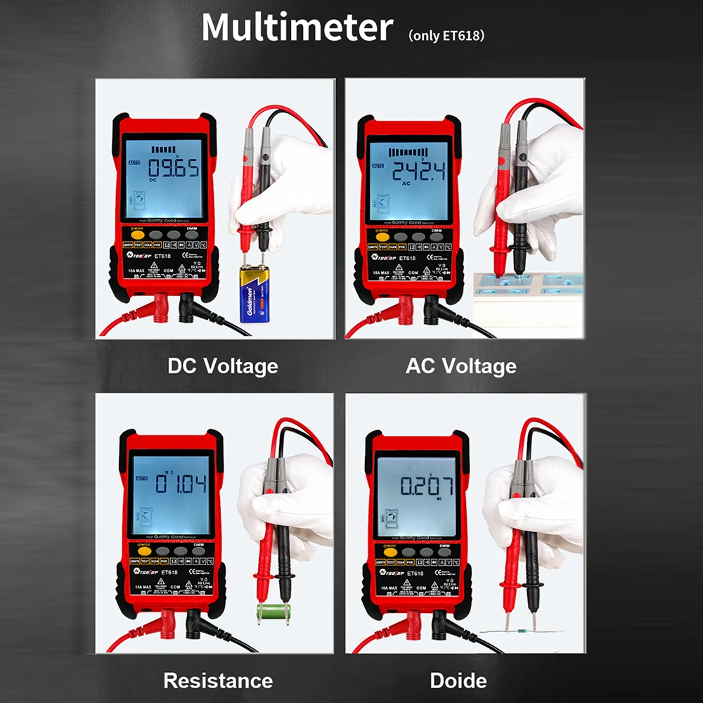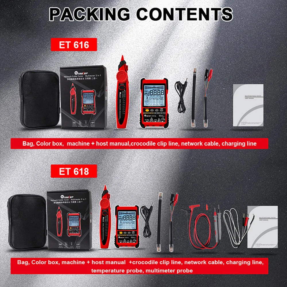 ET616/ET618 Optional: There are two different types for you to choose. The network cable length measuring ranges of ET616 is 400M, and the ranges of ET618 is 500M. Only ET618 has the multimeter functions.