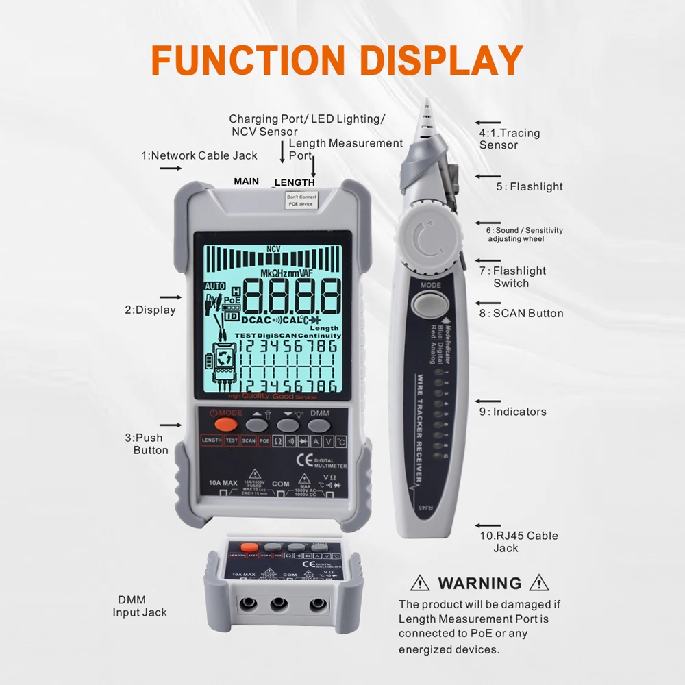 Multifunctional Cable Tester: This cable tester has the function of analogue tracing, cable mapping, PoE voltage measuring, digital tracing sensitivity adjustable, etc.