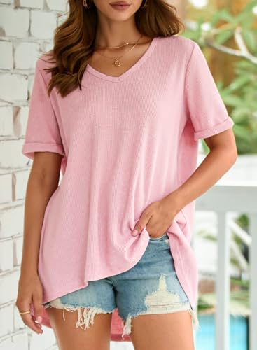 EVALESS Womens Summer V Neck Tops Short Sleeve Waffle Knit Shirts Cotton T Shirts Sol …