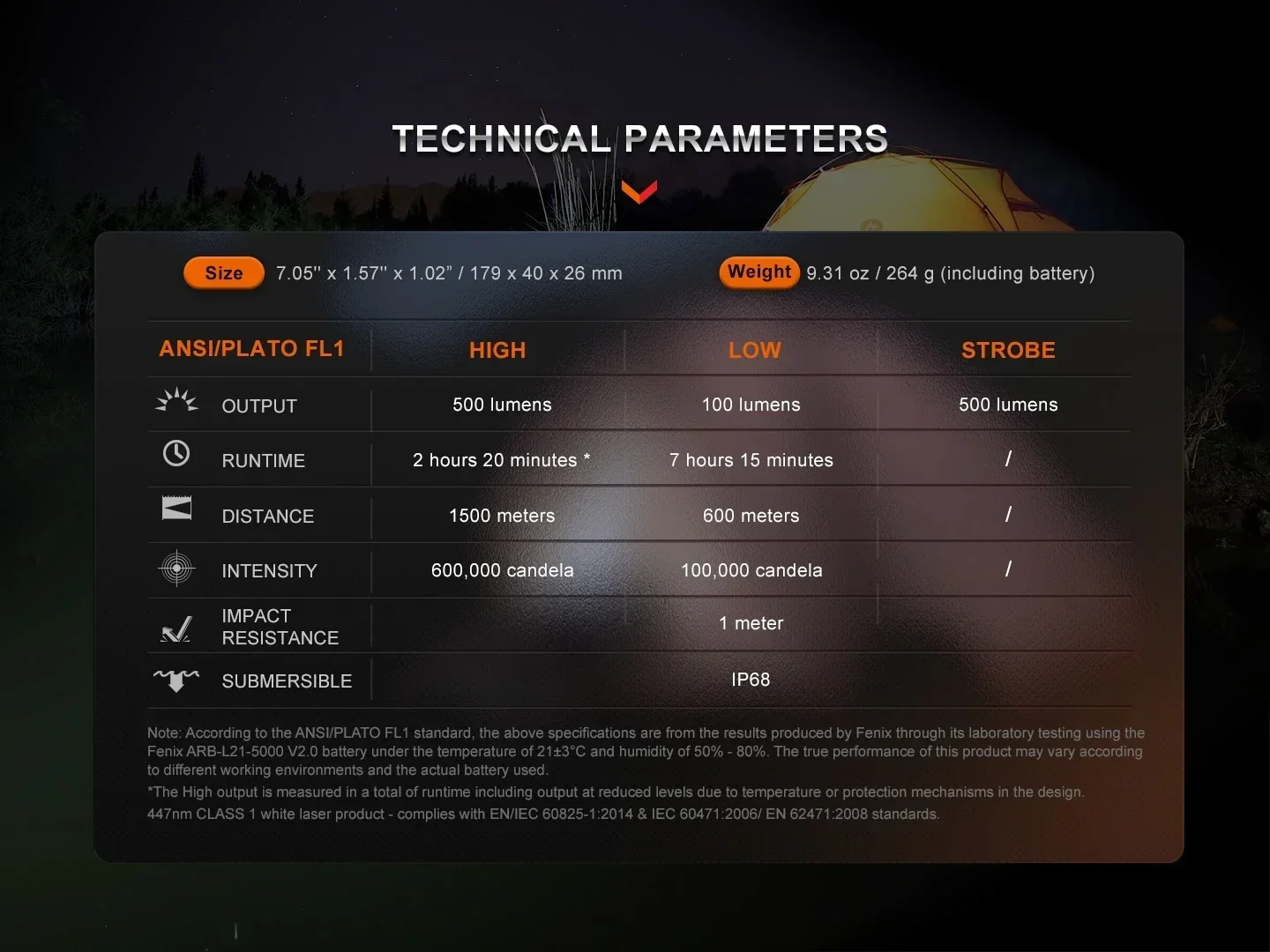 500 lumens maximum output, 1500 meters maximum beam distance.