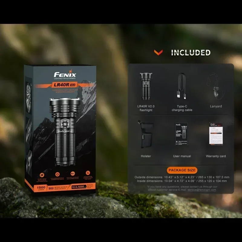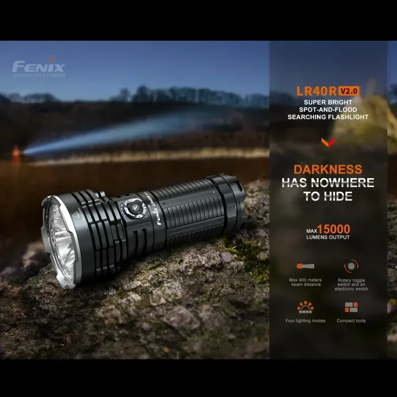 Fenix LR40R is a high-performance rechargeable ultra-compact searching flashlight that combines spot-and floodlight. You can operate the light with one hand with a toggle and electronic switch combination. Catering for numerous outdoor and extreme environments, this light is an indispensable helper in cave exploring, searching and rescuing, as well as acting as a backup light for drivers.