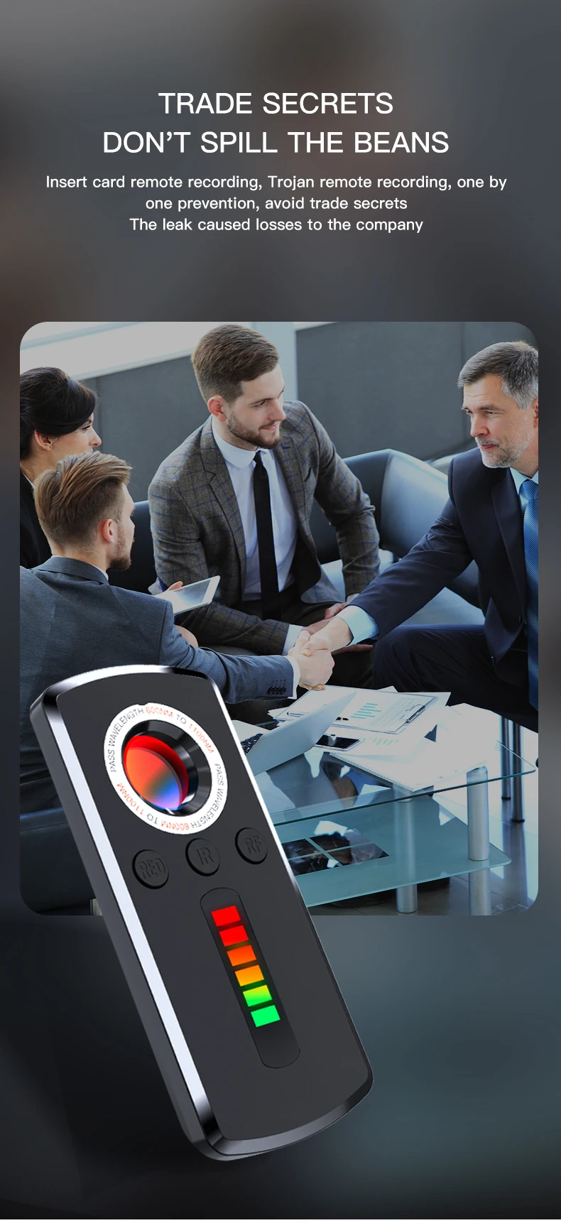 Generally seen on the market wireless surreptitious camera, remote recording bug, GPS locator, tracker, are used to insert cell phone traffic card or wifi connection, only the traffic card and wifi connection they can transmit the data recorded secretly. Therefore, our signal detector, it can be very accurate to capture the signal when it uploads and downloads data, once the device has data flow, you can immediately sense it.
