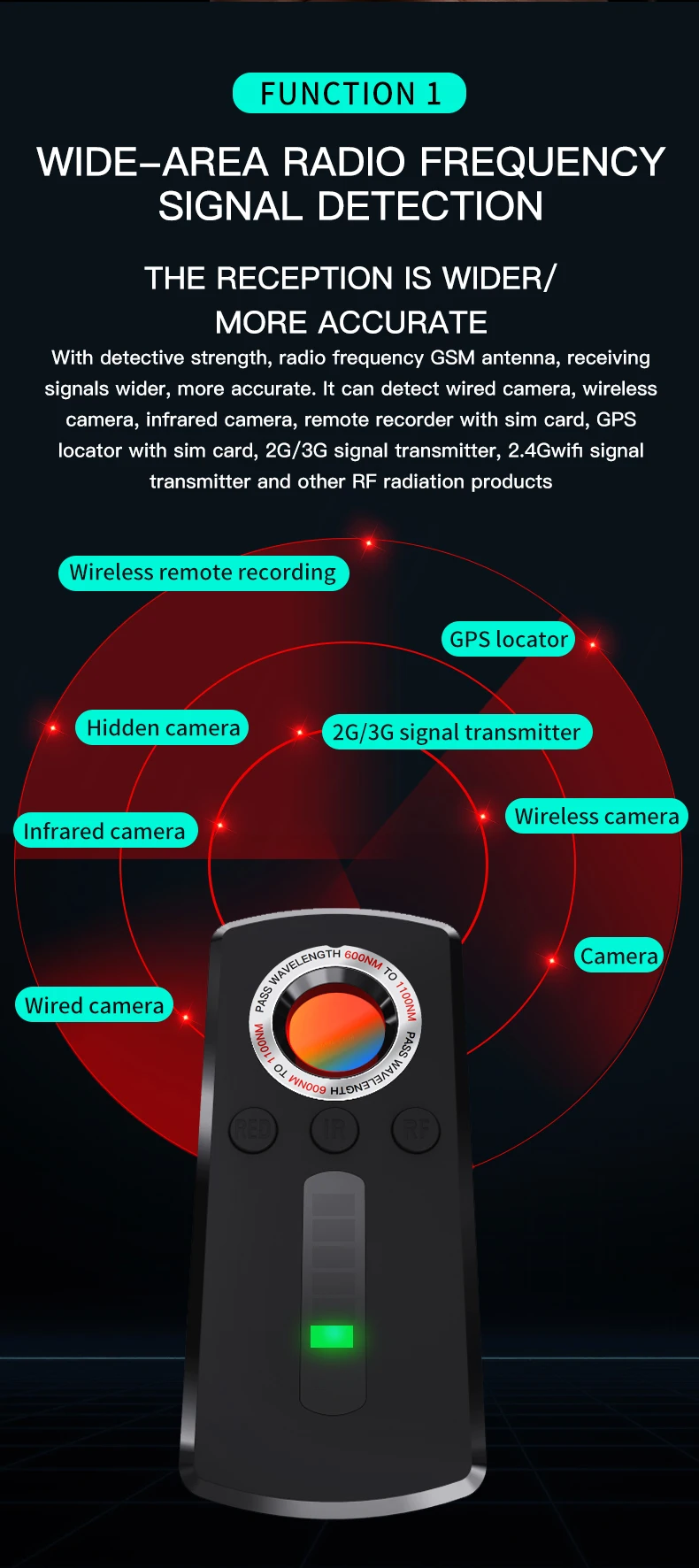 It has detective capabilities and a radio frequency GSM antenna, which can receive wider and more accurate signals. It can detect wired cameras, wireless cameras, infrared cameras, remote recorders with sim cards, GPS locators with sim cards, 2G/3G signal transmitters, 2.4Gwifi signal transmitters and other products with radio frequency radiation.Function 2