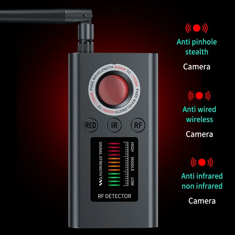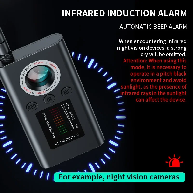 Press and hold the function key "RED" to turn this function on or off, and the 5 high-power laser LEDs on the back will light up. This function uses a high-brightness red LED laser combined with a special optical filter to visually observe whether there is a camera device in the surrounding environment, and uses the physical properties of the glass lens material of the camera device to reflect light to determine the location of the camera device. During the scanning process, if you find multiple red reflective spots somewhere, please get closer and observe them carefully. The effective distance of this function is within 5m.