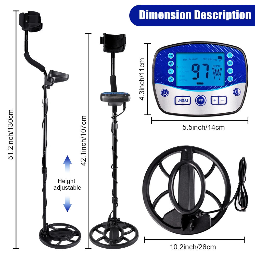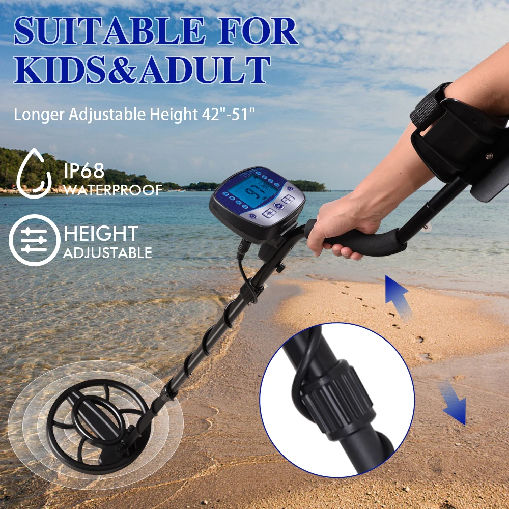 【Adjustable Height & Ergonomics Design】: The metal detecting device is equipped with adjustable rod from 26" to 38.6" (total length is 40" to 51"), which makes it suitable for adults, kids and teenagers size.