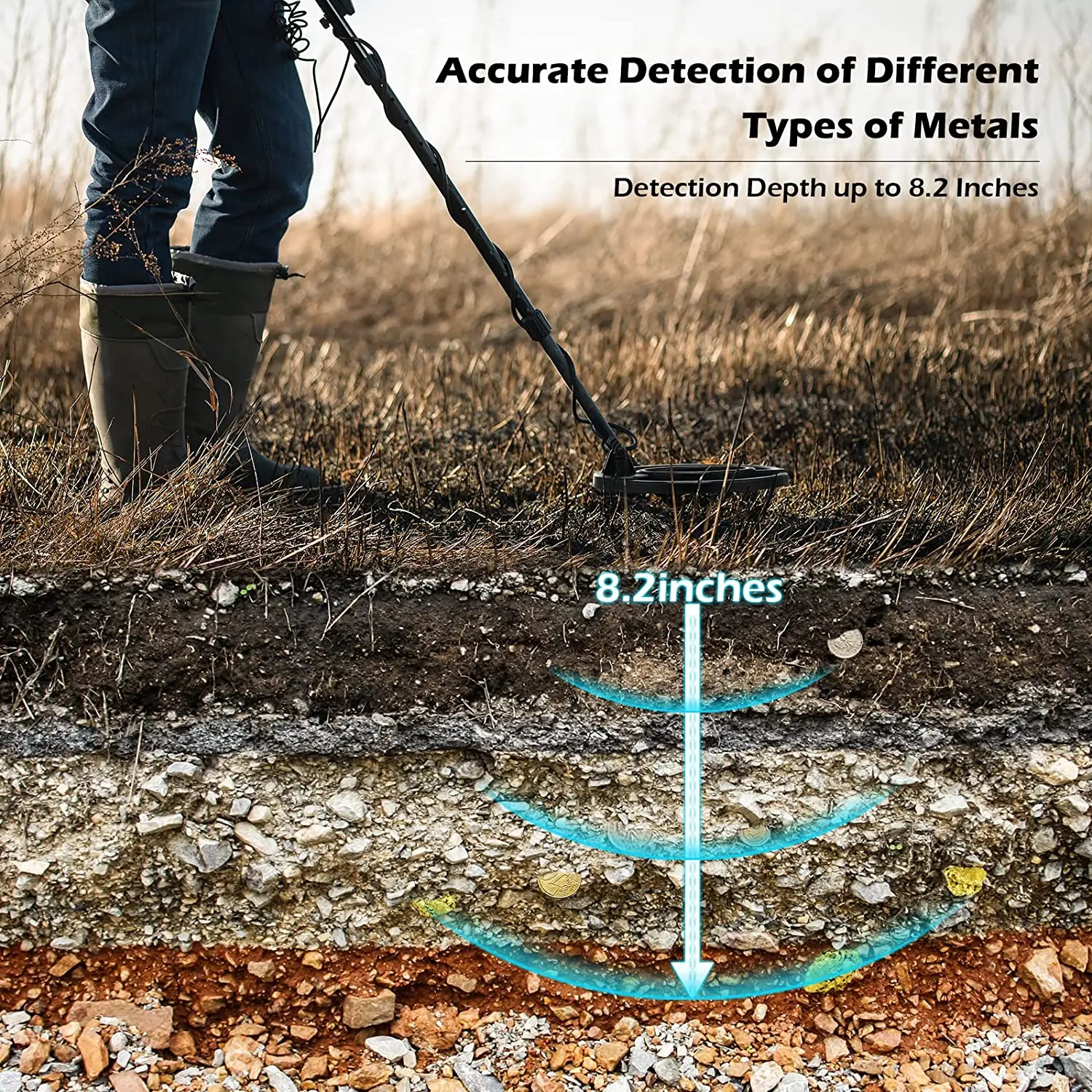 【3 Audio Prompts & Depth/Sensitivity Adjustable】: The unique audio prompt emits 3 different tones for different types of metals. Adjust the depth indication for objects 2", 4", 6", 8" with up or down key.