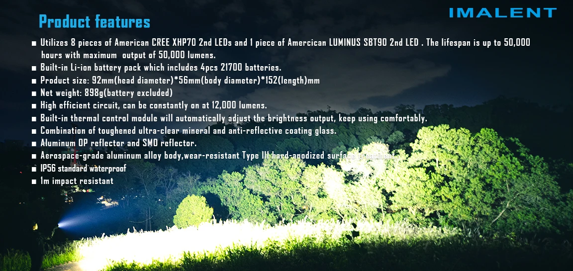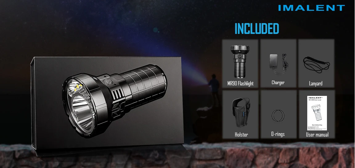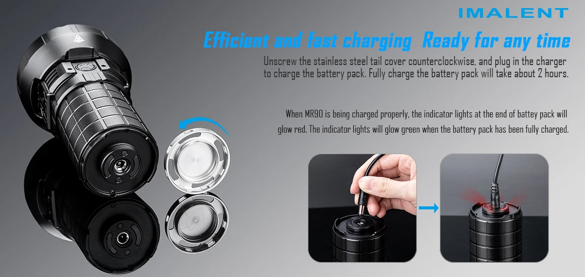 The 50,000-lumen Imalent MR90 flashlight is designed to be a powerful rechargeable flashlight for any situation where it can be used for long periods of time, illuminate large areas, and illuminate an object from a great distance.