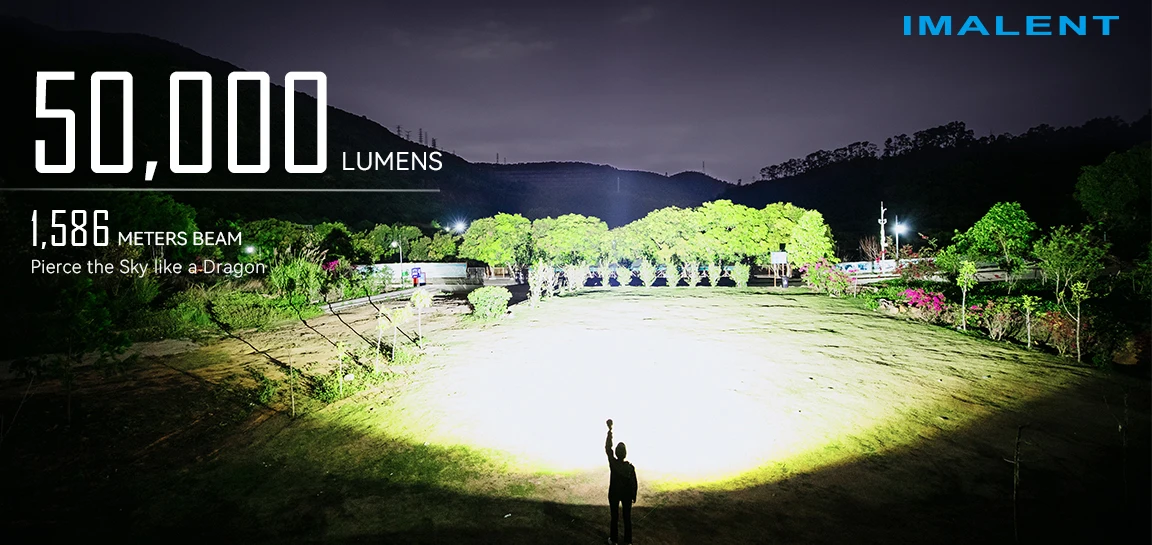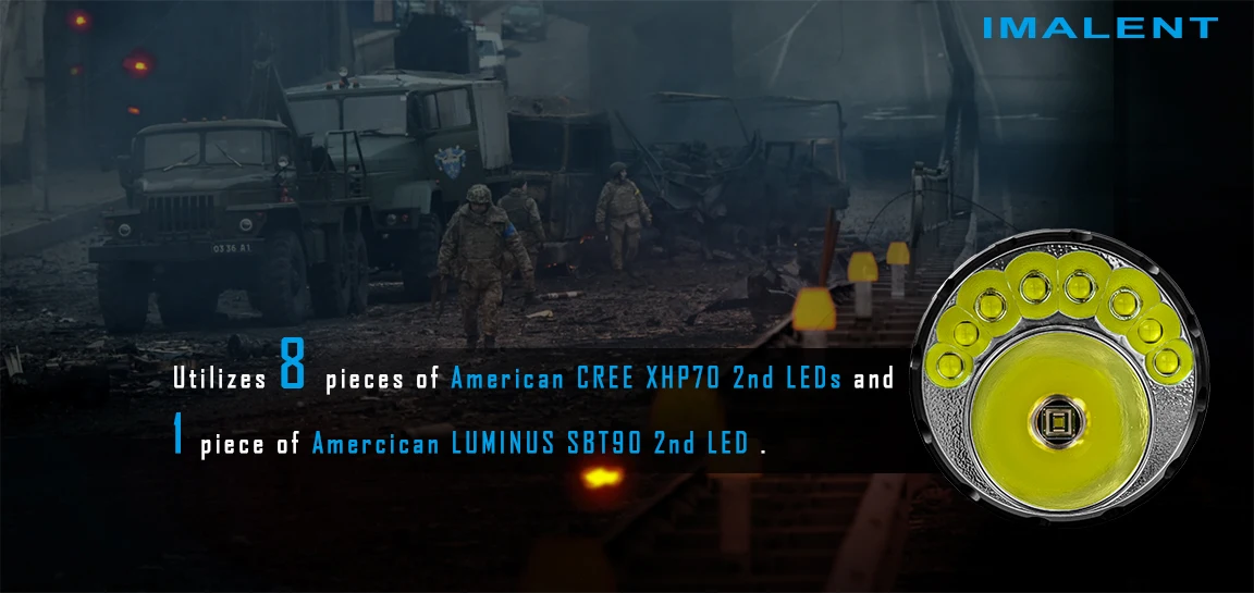 IMALENT MR90 is a 50,000-lumen powerful LED flashlight with dual beam capability, featuring a star layout design with 8 CREE XHP70.2 LEDs and 1 SBT90.2 LED, producing up to 44,500 lumens of flood beam and a maximum of 5,500-lumen, with a beam distance of 1,586 m.