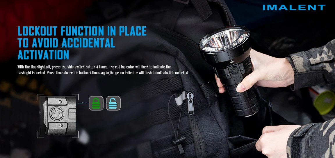 This Imalent MR90 flashlight has a lock function, with the flashlight off, quickly press the power switch button 4 times,the indicator will flash 3 times to indicate the flashlight is locked. Press the switch button 4 times again, will flash the green indicator to indicate it is unlocked and can work normally.