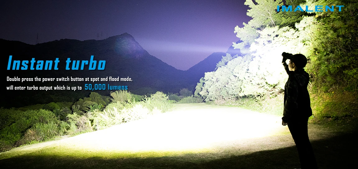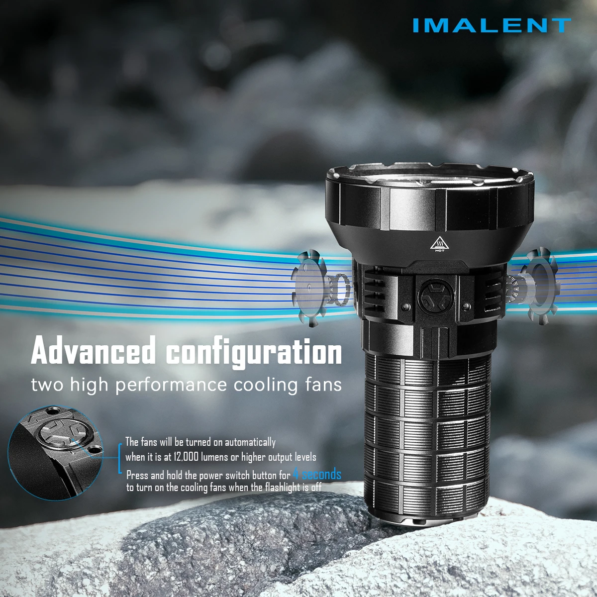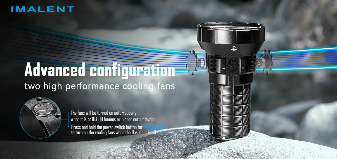 IMALENT MR90 is a powerful dual-model tactical flashlight with two cooling fans. the newly adopted cooling fans will cool down the heat.