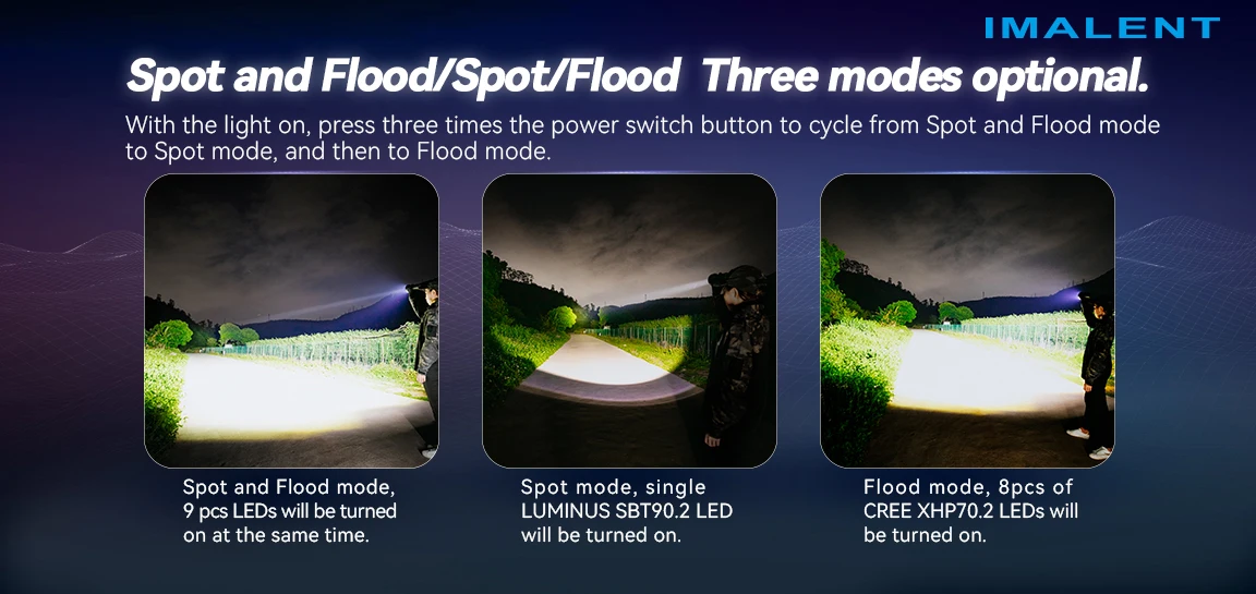 Spot and Flood mode: Use 9pcs LEDs will be turned on at the same time.