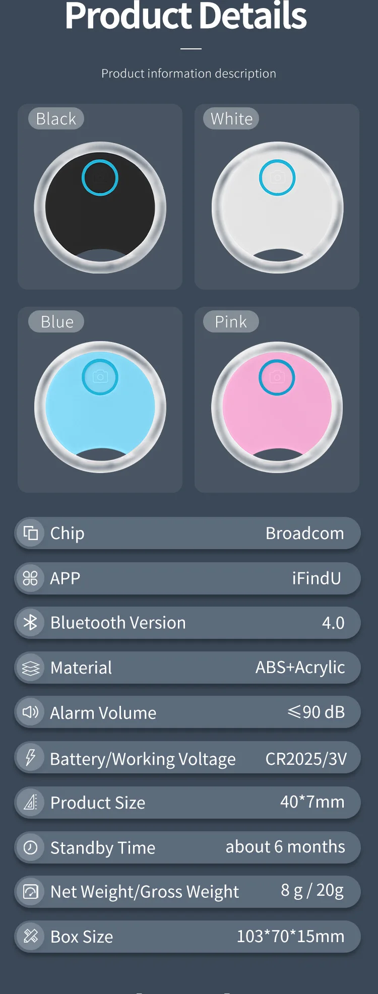 1. Bluetooth 4.0 Technology: The anti-lost device is based on the latest Bluetooth 4.0 low-power technology, which makes it easy to connect to mobile devices such as smartphones and tablets.