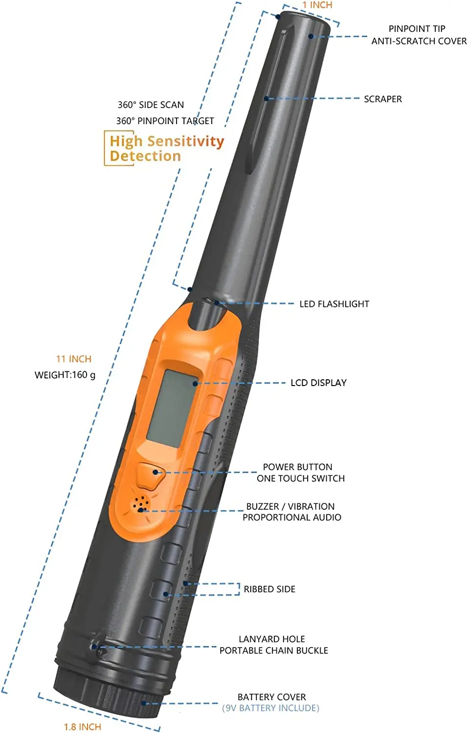 LCD Display Fully Waterproof Pinpoint Metal Detector Pinpointer – 360° Search Pinpointing Finder Probe Treasure Hunting Tool Accessories for Adults and Kids (Three Mode)