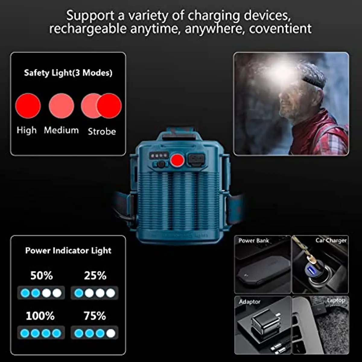 Easy to charge-USB InputUSB Rechargeable Headlamp charged by USB Cable , you can charge directly via any usb port, like power bank, car charger, computer and etc. | Power DisplayLED rechargeable headlamps have the power display function, no longer have to guess the remaining power of the headlamp. | Super Bright HeadlampThis bright headlamp is rechargeable (equipped with 3 * ΒATTERY), so if you set off outdoors fully charged, then you can safely carry on using it for more than 10 hours. |