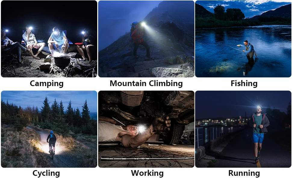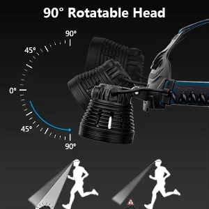 90° AdjustableThe headlamp can be adjusted up and down to 90°, helps you focus light exactly where you need it. Wearing it, you can clearly see the scenery or obstacles ahead or under your feet. | Adjustable and ComfortableElastic and adjustable headbands ensure comfort and convenient, this led headlamp fit for different head circumference. | IPX5 WaterproofWaterproof headlamp adopts IPX5 waterproof, it can withstand the test of all kinds of weather. When you are out hiking or camping, the weather suddenly changes, so you don't have to worry. |