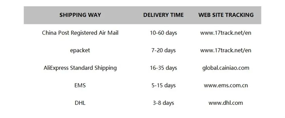 Other countries: 15 – 45 days by China Post Air Mail or Aliexpress standard shipping.