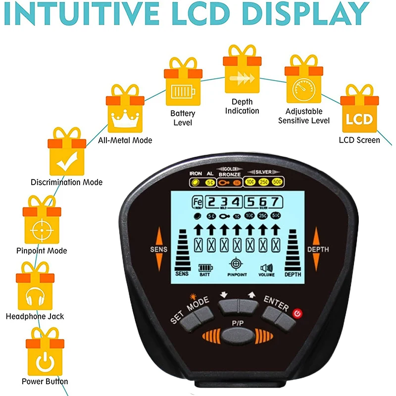 3.4-inch LCD Display: shows the probable type of metal with an arrow, the depth of the target, DISC range, the level of SENS with segment, the operating mode, and battery condition.