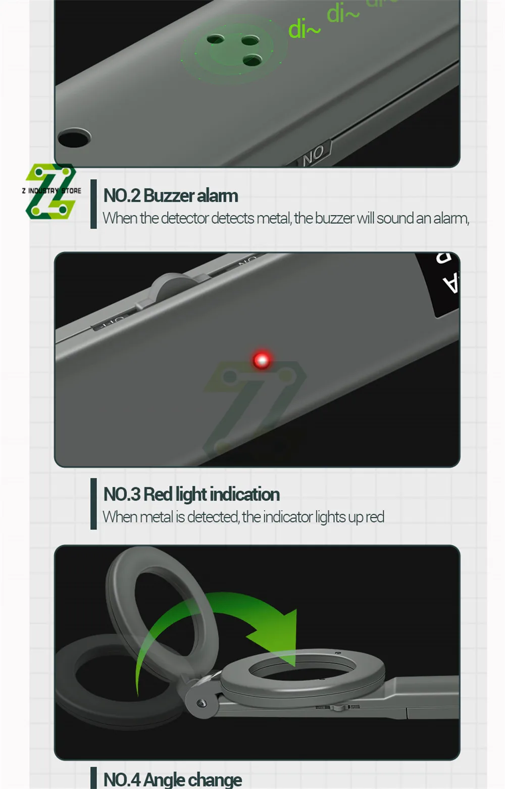 3. When the detector detects metal, the buzzer will sound an alarm and the indicator light will be red