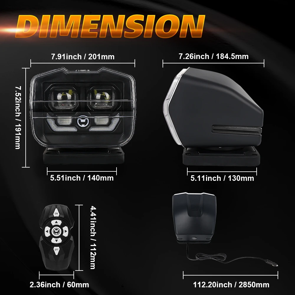 Remote Control&Lighting Distance: This remote control distance of new design remote control search light could reach to 328Ft(100m). Wide range of lighting, rotate 360° left and right, the irradiation range is a circular area with a diameter of 1640Ft(500m), tilt 40° up and down, the irradiation range is a fan-shaped area with an area of about 8500 square meters.
