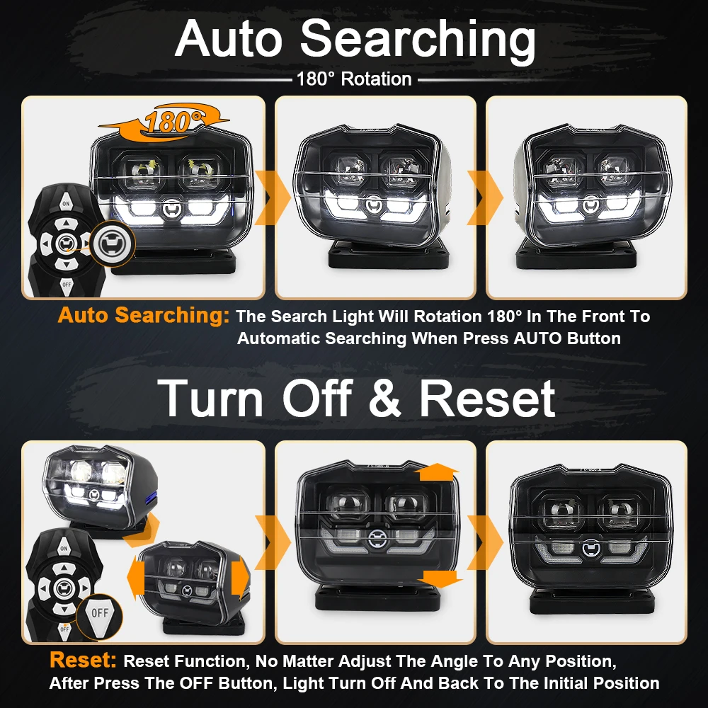 Automatic Searching&Reset: This brand new unique Design LED Search Light, upgrade with 2 fantastic function. Function 1: Automatic Search, 180° automatic cycling searching in front when Auto button. Function 2: Reset Function, OFF button, Not just turn off light, the search light also automatic to move back to the initial position, no need to move by click the left and right button.