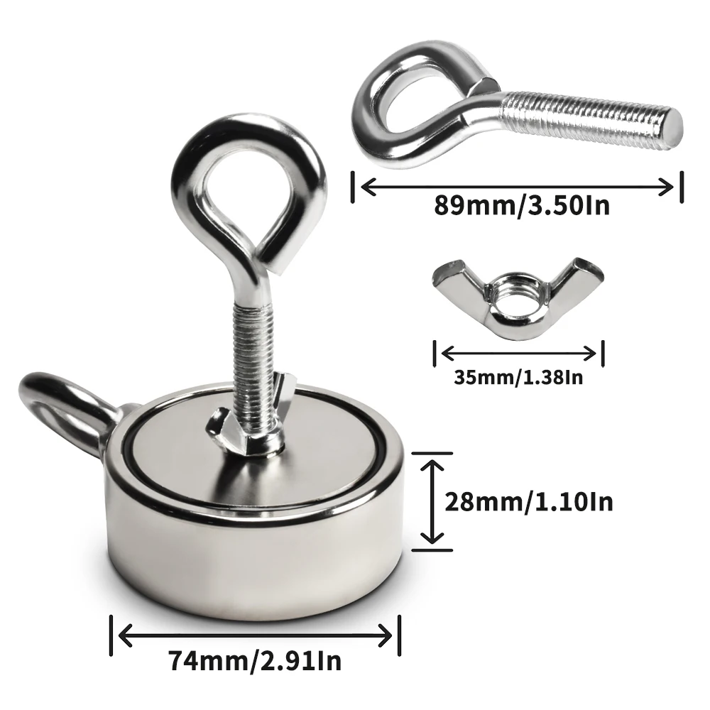 The ring on the bidirectional search magnet allows for more precise selection of position and manipulation of equipment. With it, you can search for metal objects of different sizes in turbid water: